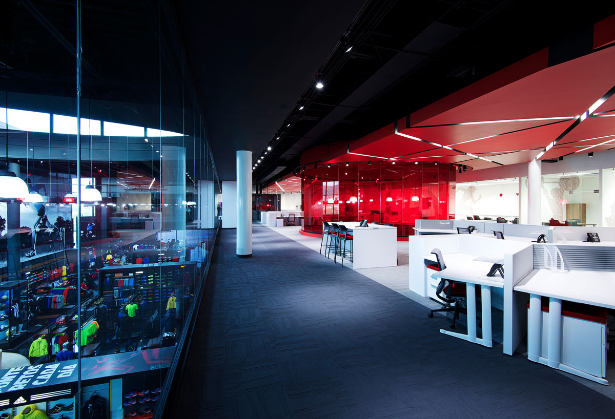 The design directive from Innovasport’s leadership for their corporate office was clear: “Build on the energy of our retail experience.” The resulting workspace reflects a minimalist yet vibrant design that channels the brand’s dynamic spirit. The striking asymmetrical red panel ceiling installation, intersected by a linear lighting system, is paired against matte black vertical fins enhancing the adjacent boardrooms.